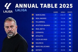 体育资讯12月28日讯 2025年即将过去,《转会市场》也统计了2025年西甲总积分榜情况,巴萨独自居首。